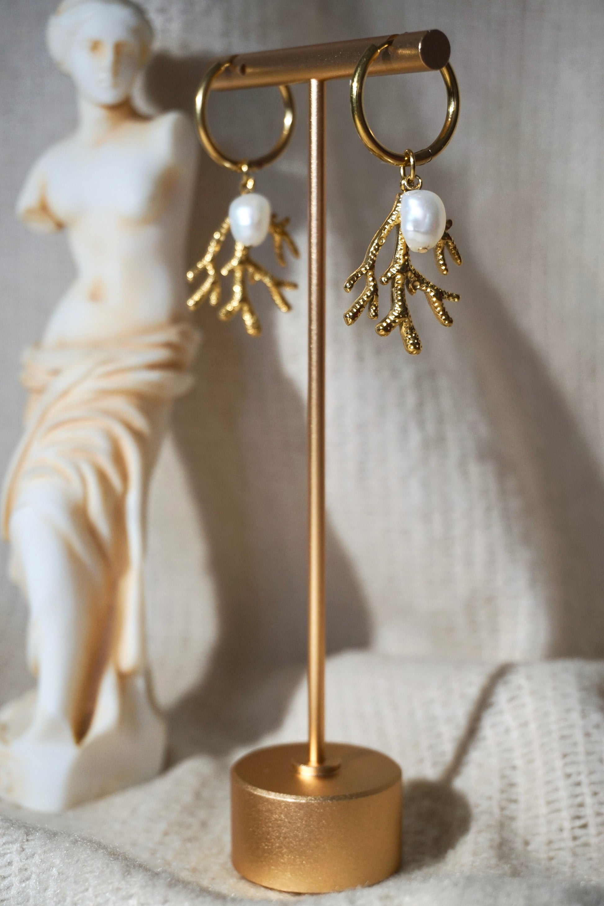 Créoles en acier inoxydable doré, ornées d’une branche de corail en plaquée or aux détails martelés et d’une perle d’eau douce baroque, pour une touche nacrée et élégante.