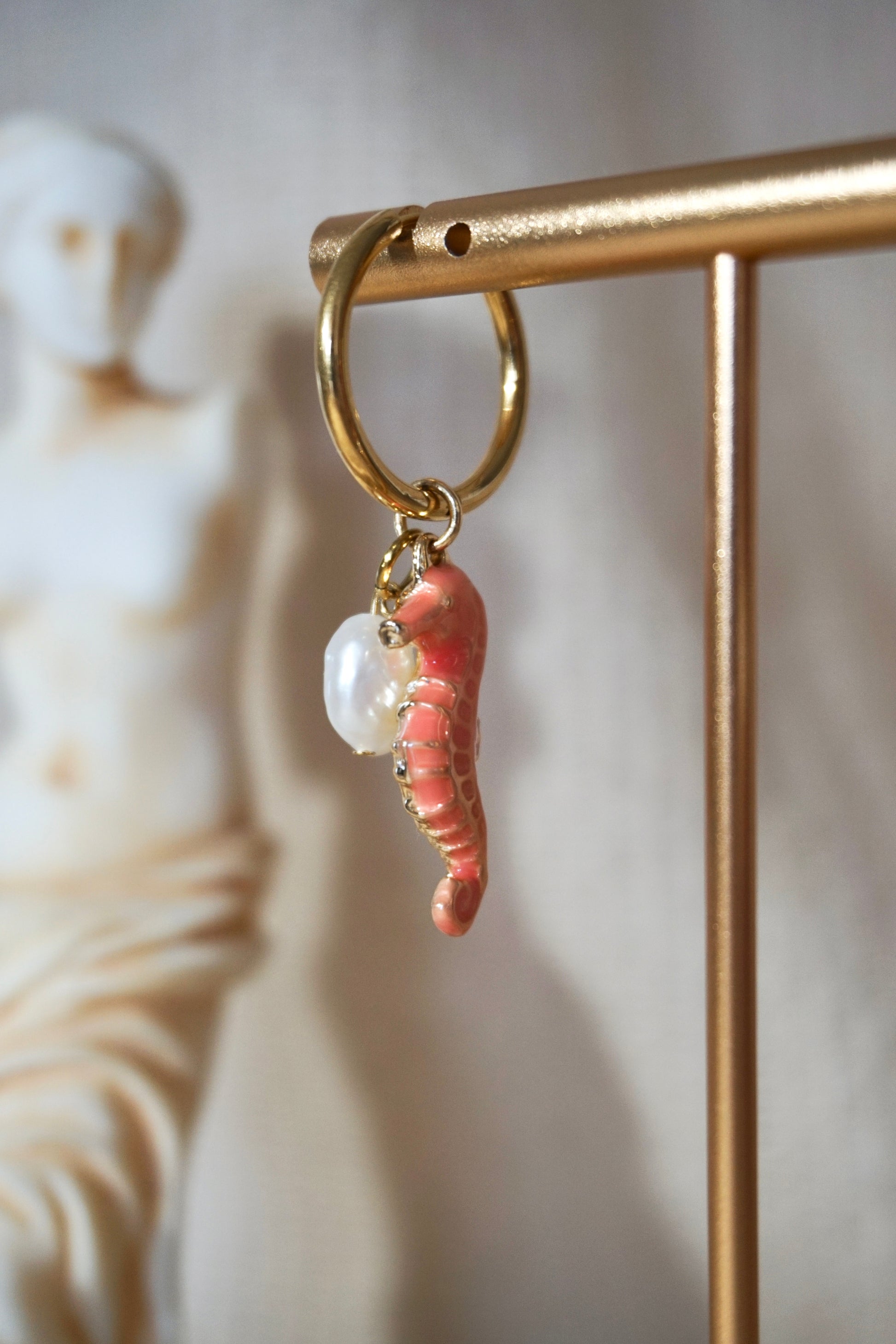 Créoles en acier inoxydable doré, ornées d’un hippocampe — symbole de grâce, de sérénité et d’équilibre — de couleur saumon en plaqué or et bronze, et d’une perle d’eau douce baroque pour une touche colorée et raffinée.