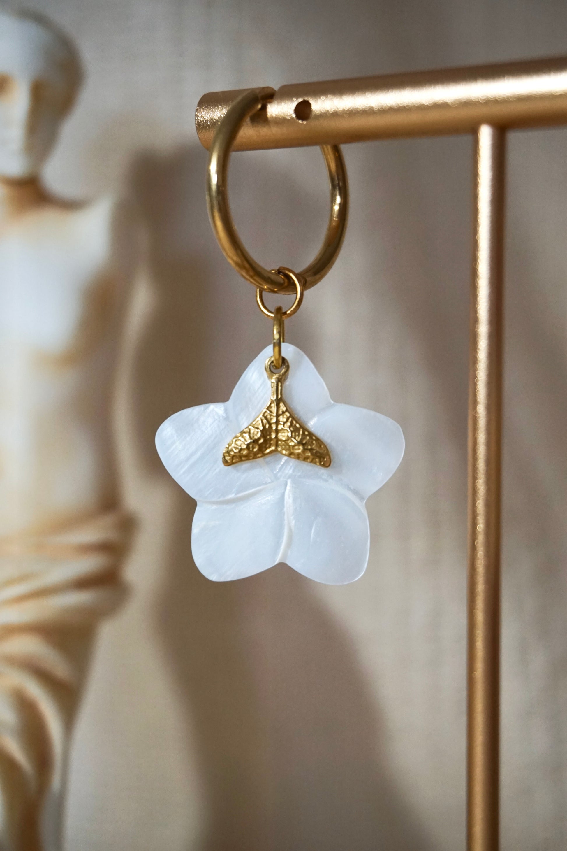 Créoles en acier inoxydable doré, ornées d’une jolie fleur de frangipanier en nacre et d’une queue de sirène en plaquée or aux détails martelés, pour une touche raffinée et poétique.