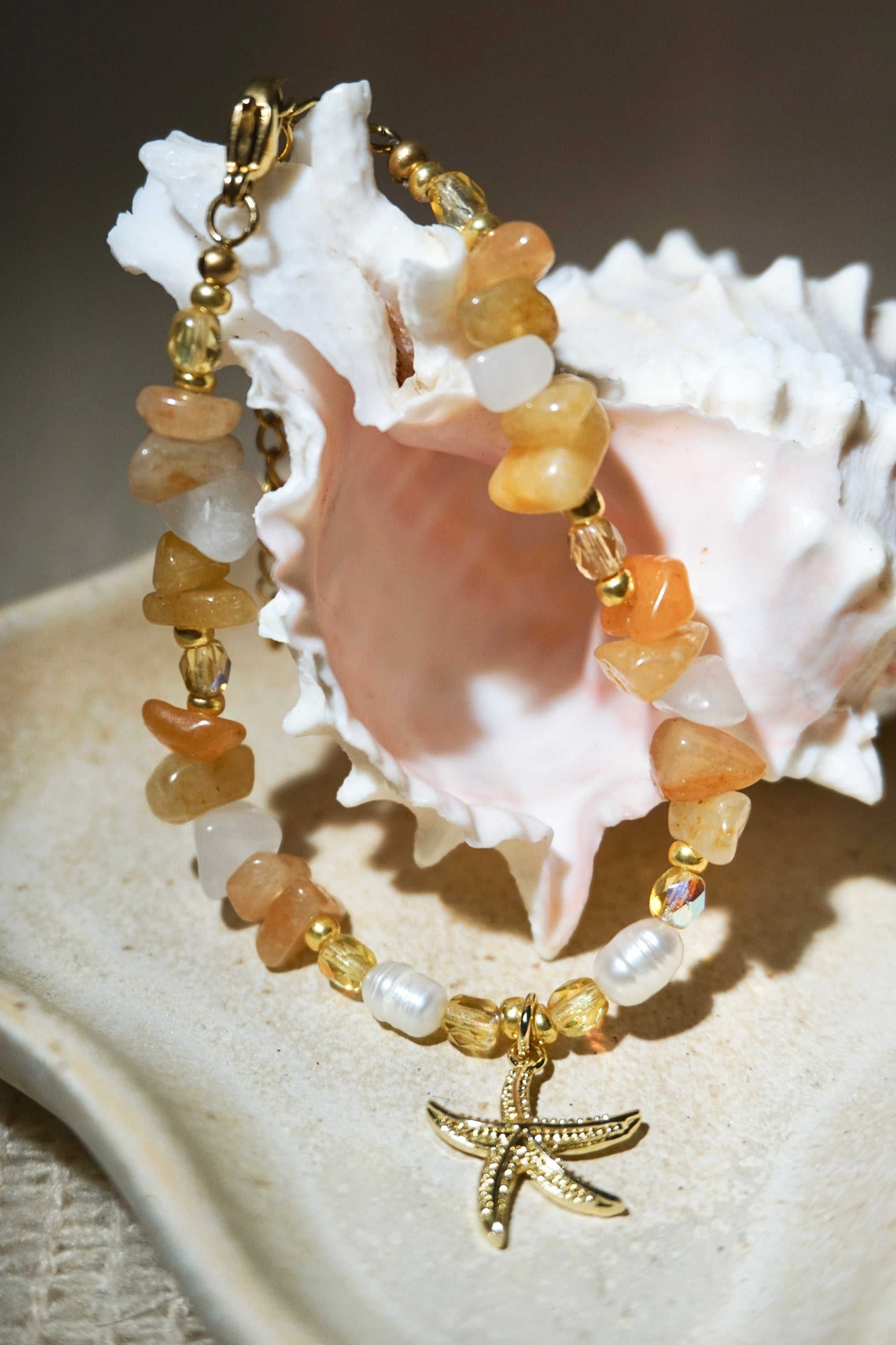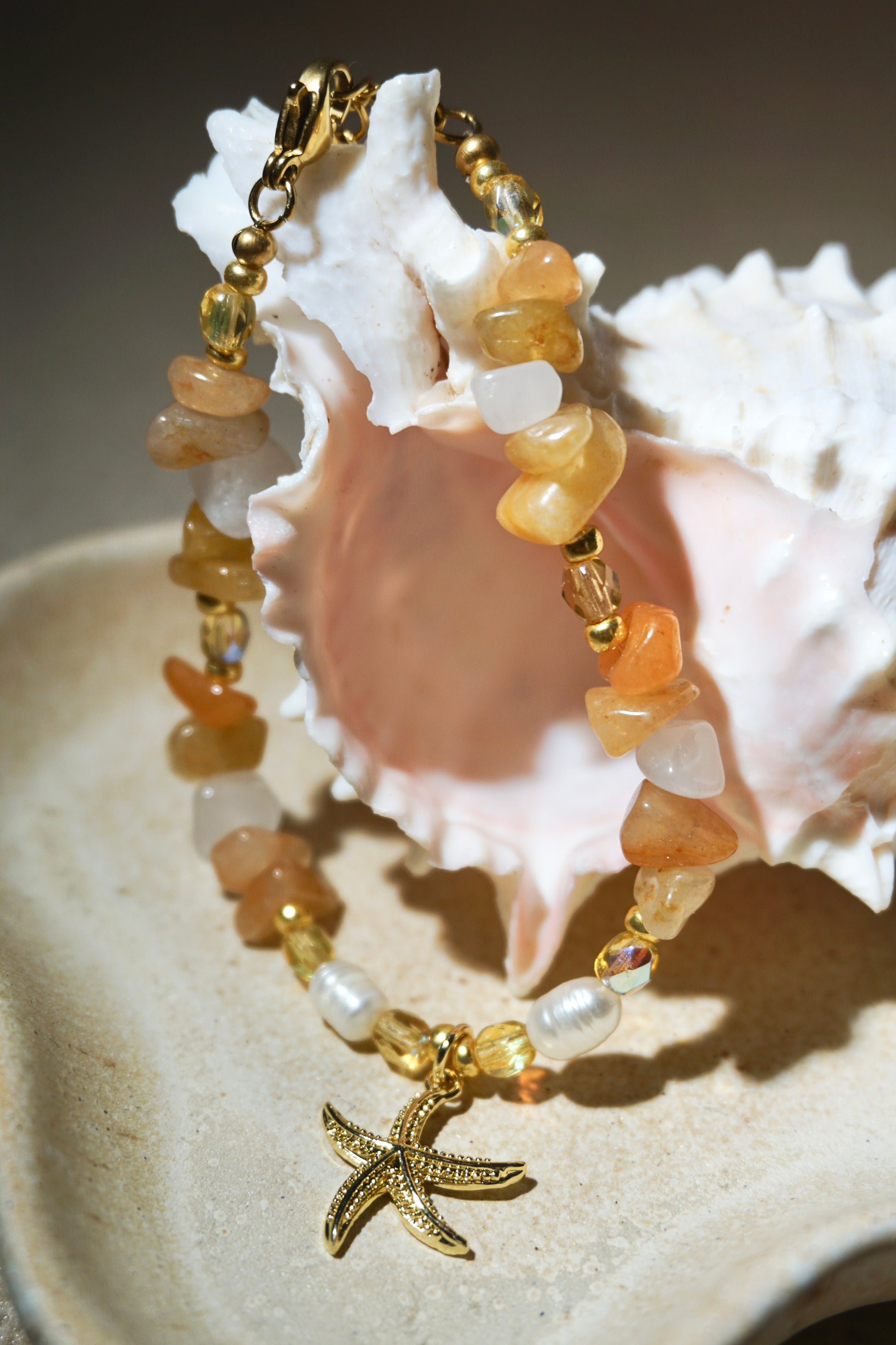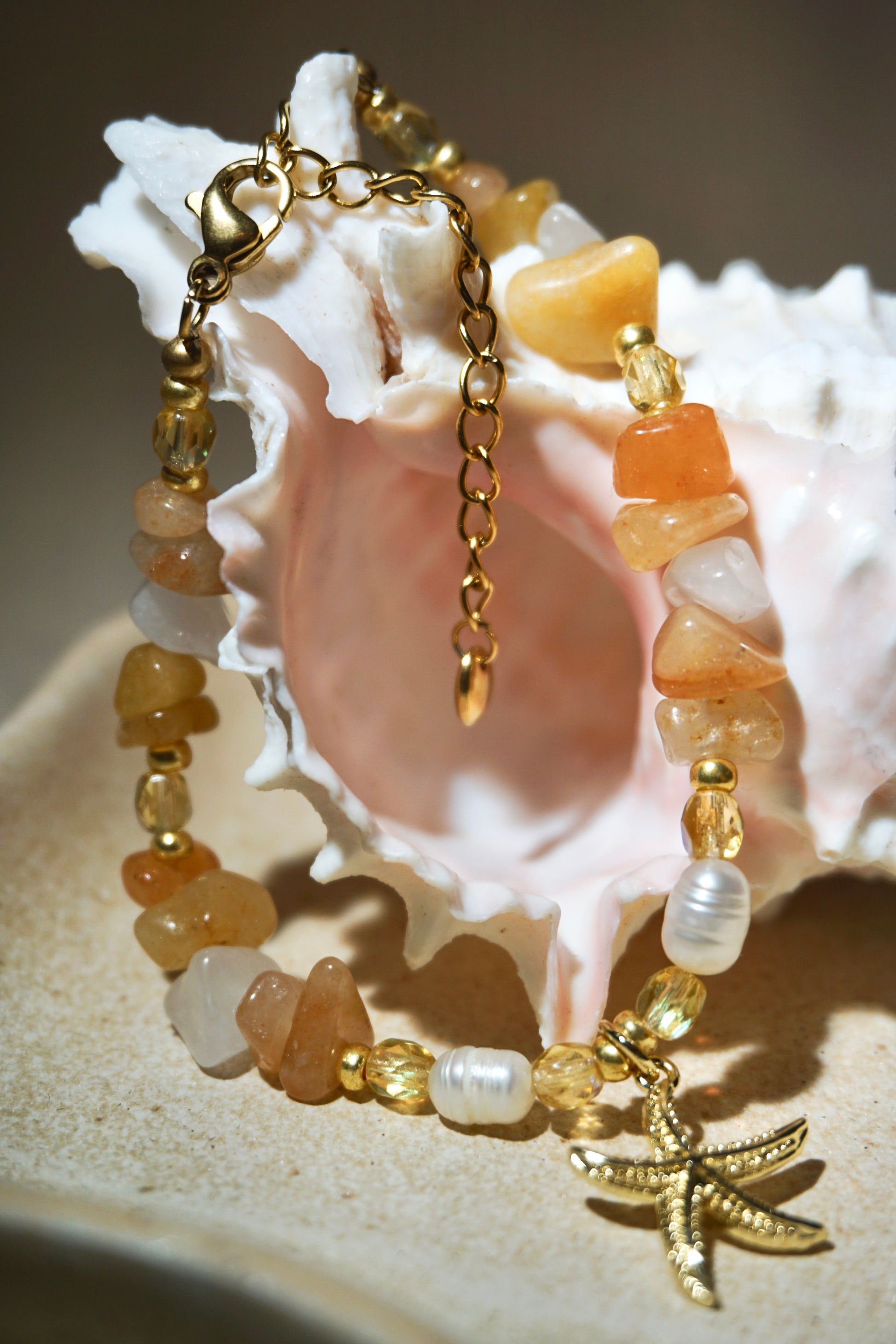 Ce bracelet est composé de pierres naturelles orangées et blanches, de perles d’eau douce, de perles de cristal Swarovski, de perles de rocailles, et d’un fermoir avec chaîne d’extension ajustable en acier inoxydable. En son centre, un pendentif étoile de mer en bronze — symbole de renouveau, d’harmonie et de confiance en soi.